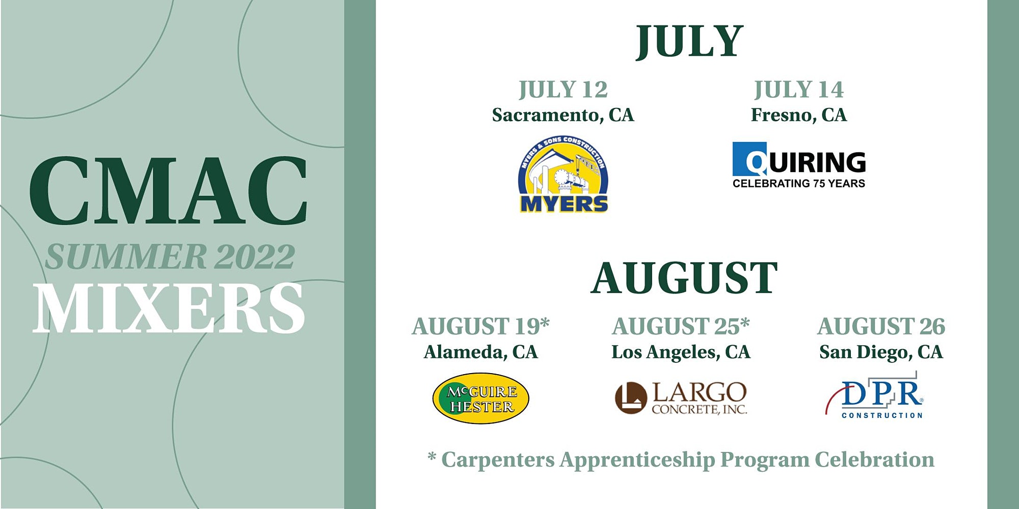We look forward to connecting with you at five CMAC mixers this summer throughout California hosted by five Construction Management Advisory Council (CMAC) member companies.